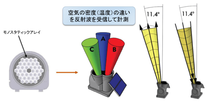 音波を上空に発射し、空気の密度(温度)の違いによる反射波を受信し計測します