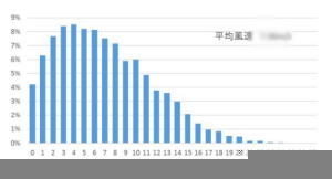 一般的には超過確率50%(P50、平年値相当)、75%(P75)、90%(P90)、95%(P95)となり、太陽光発電などのプロジェクトファイナンスよりストレスをかけた評価が行われるケースが多くなります。
